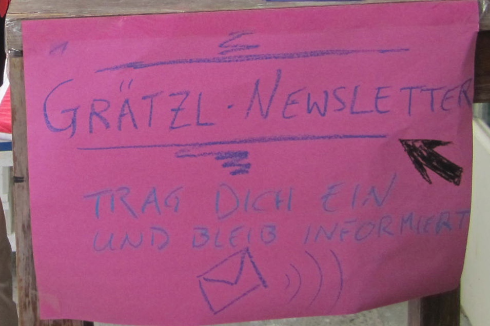 Mirjam Mieschendahl: Die Förderung, die wir bewilligt bekommen haben, macht ca. 50 % der Projektkosten von der imGrätzl Plattform aus, den Rest finanzieren wir aus unserer eigenen Tasche. Die Aktionen hier am Vorgartenmarkt sind ehrenamtlich, da gibt’s keine Förderung. Wir freuen uns, dass wir dank der Agora Marktbiennale den Raum nutzen dürfen. Dass wir hier sitzen dürfen ist die Förderung, wenn man so will. Die Pop-up Messe wird finanziell unterstützt von der Grätzloase, das betrifft zum Beispiel den Druck von Flyern und Anmietung von Mobiliar für die Aussteller. Wobei die Arbeitszeit natürlich auch hier wieder ehrenamtlich geleistet wird.