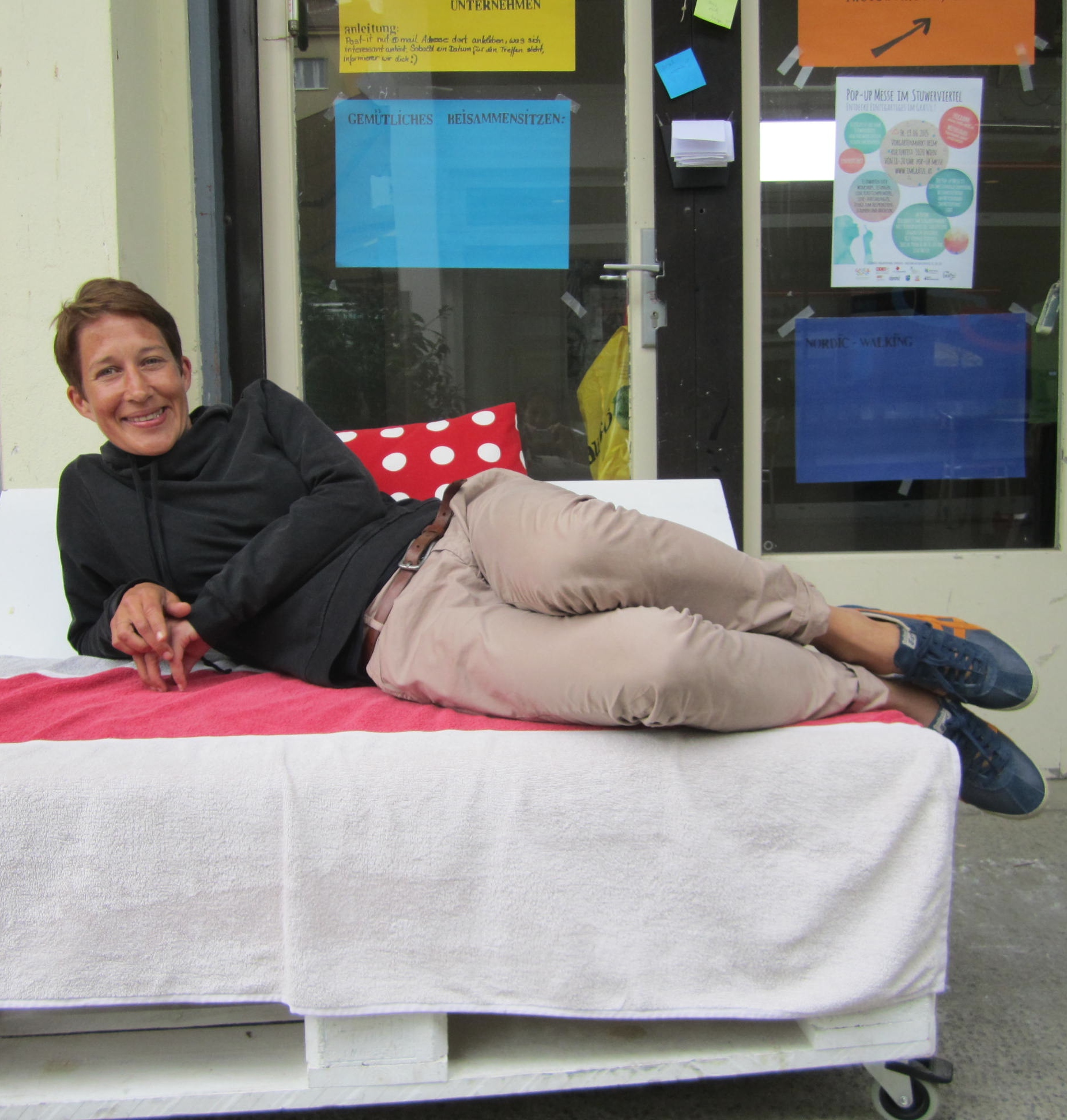 Mirjam Mieschendahl: Das ist jetzt schon voller Erfolg! Ich möchte nicht mehr weg von hier, wir alle wollen nicht mehr weg! Mein Ziel war es, mit Leuten ins Gespräch und ins Plaudern zu kommen. Zu fragen, was gefällt euch im Stuwerviertel und was vermisst ihr etc. Einfach zu schauen, was die Menschen bewegt. Und zwar von alt bis jung, die ganze Bandbreite. Ich finde das herrlich. Wir hatten am Samstag die Buchtauschparty. Da kam eine 70 jährige Dame auf uns zu, und die hat uns erst mal beigebracht, wie wir das Ganze aufziehen müssen. Solche Sachen finde ich super. Über einen Online-Kontakt kriegst du das nicht so hin. Bei einem persönlichen Treffen sind jedoch alle 5 Sinne dabei und das macht es so wertvoll.